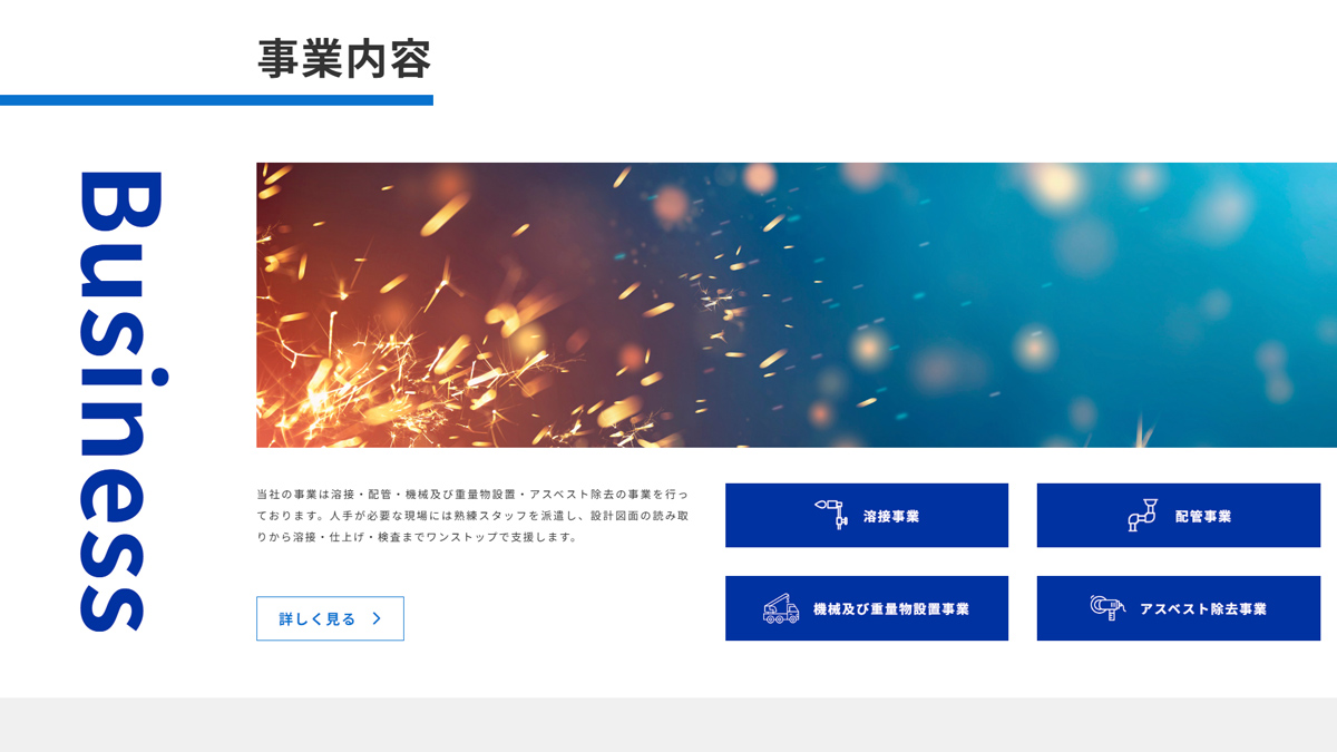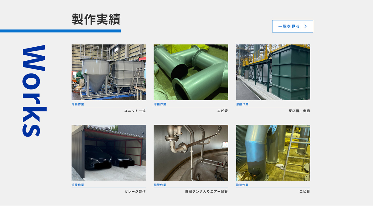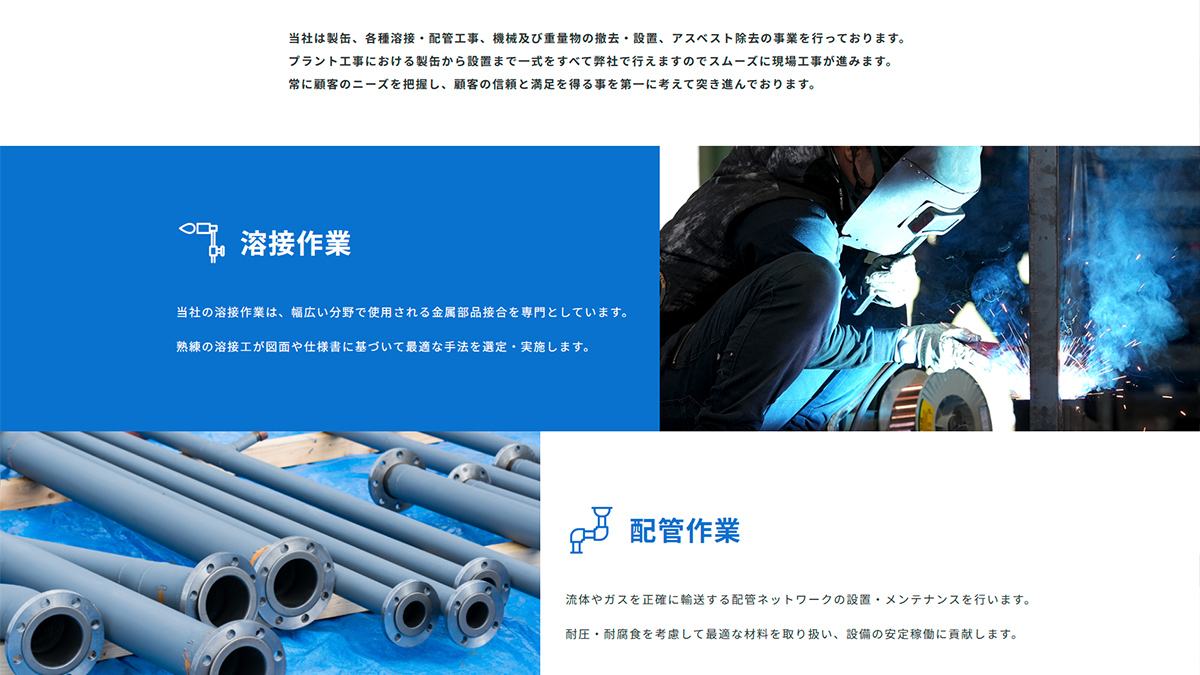 ホームページ実績製缶・溶接・配管工事のみならず組み立て後の機械・重量物設置まで一貫対応し、アスベスト除去など環境安全にも配慮した施工で顧客の信頼と満足を追求されております。