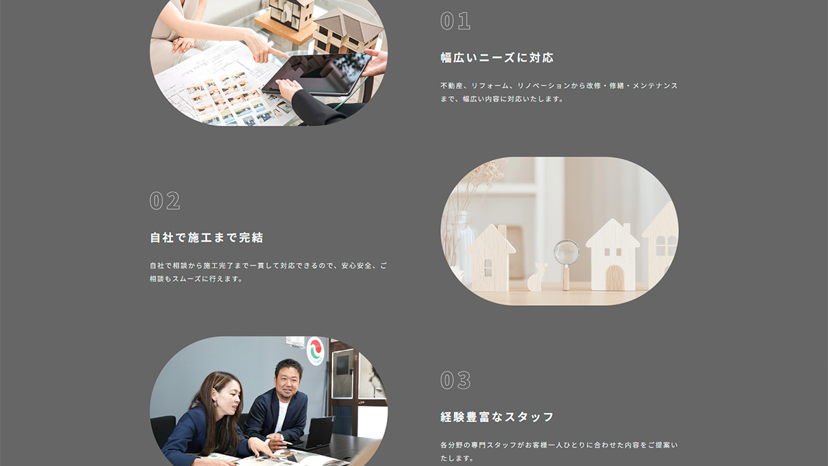 ホームページ実績姫路・高砂・相生・たつの・赤穂・太子町などの不動産や、住宅リフォーム、リノベーションをお考えの方に向けて、住まいに関するあらゆるサービスをトータルでサポートされております。