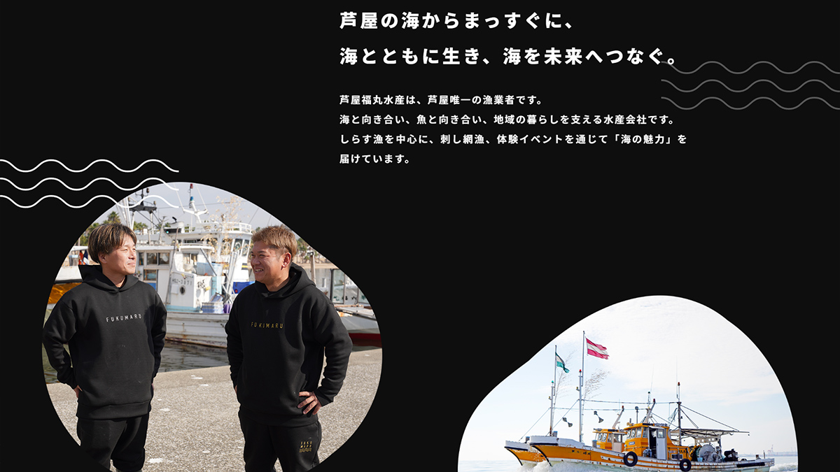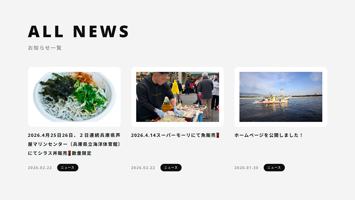 ホームページ実績芦屋・神戸でしらす漁・刺し網漁を主な業務とされており、海とともに生きる漁師の方々が獲る新鮮な鮮魚・水産物の販売、その他体験イベントなどの開催も行っておられます。