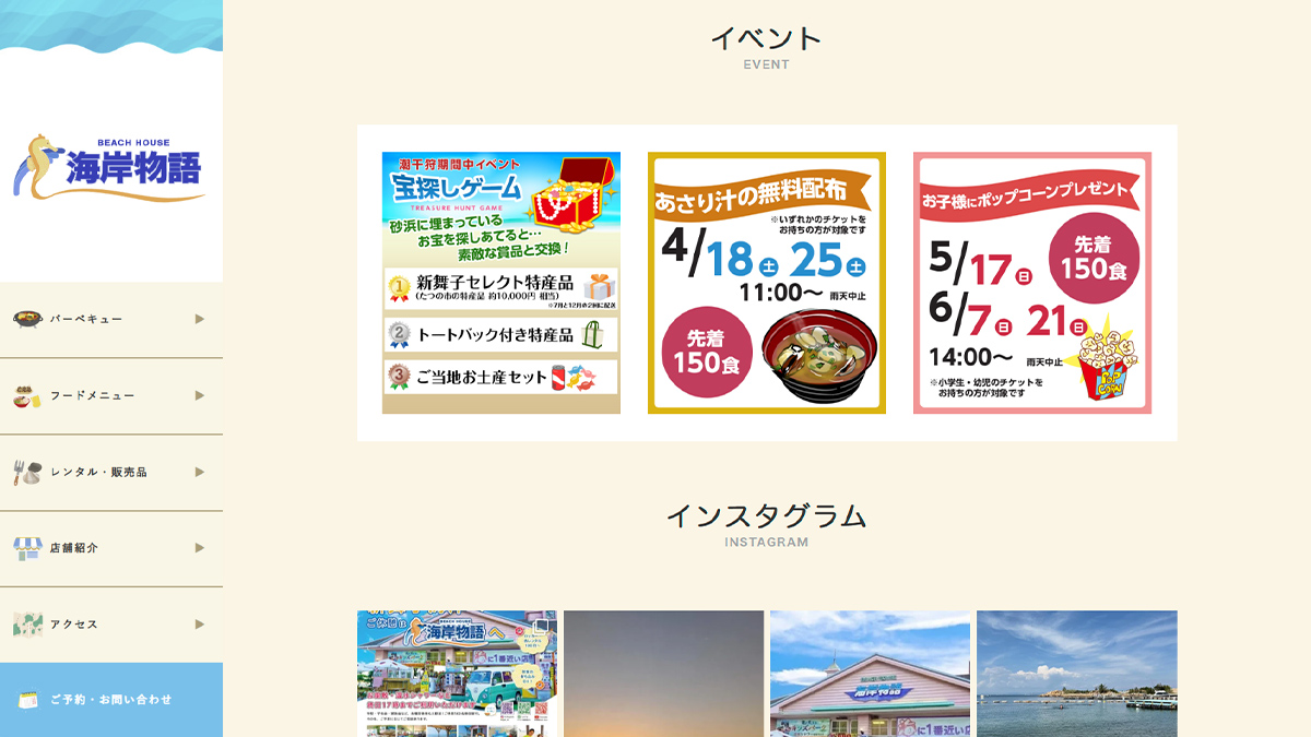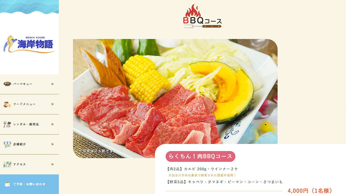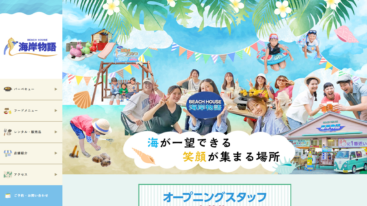 ホームページ実績新舞子海水浴場に最も近い距離で店舗を構え、バーベキューや海を一望できる180度パノラマテラスが魅力のビーチハウスです。